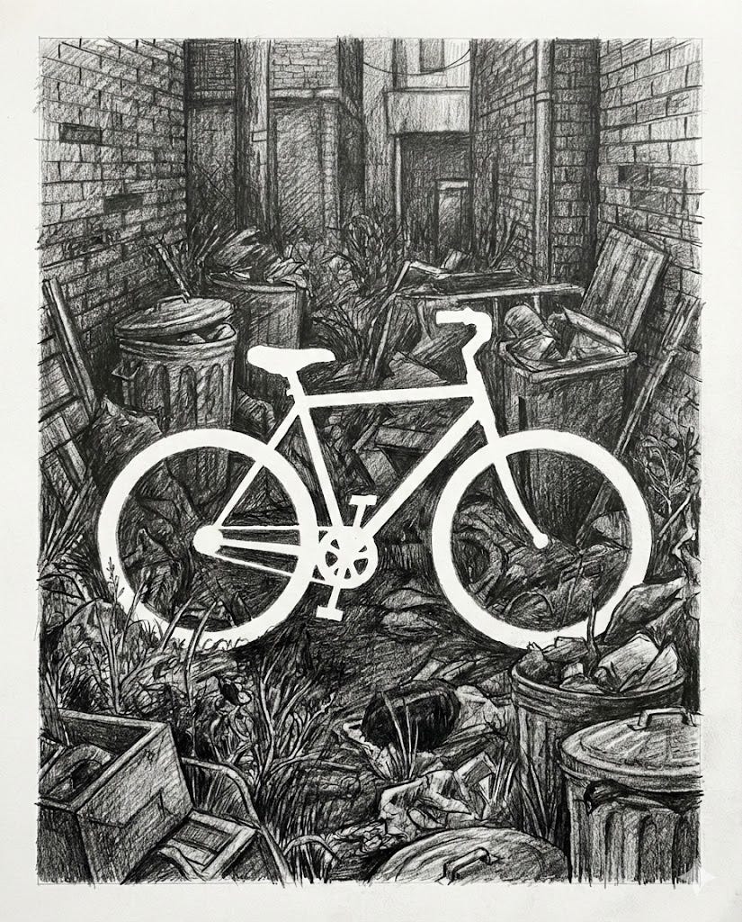 10 ) Negative-Space Bicycle – the bicycle shape is left blank; only the environment around it is rendered in graphite.