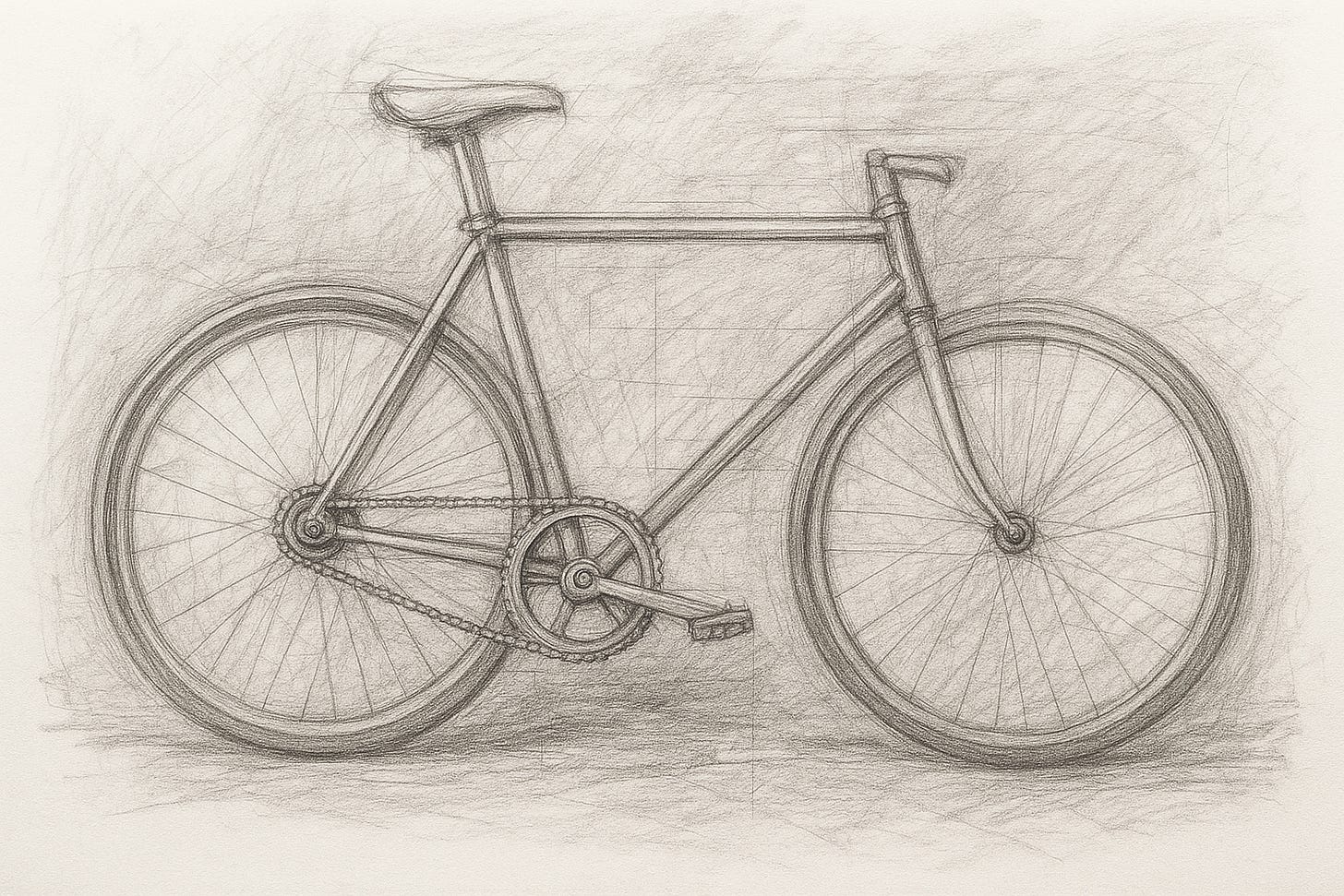 This is a decent start. You’ve gotten all the most visible parts of a bikes there, and you’ve also done some tricks to conceal some of the most difficult to draw areas; chain cover over the top of the chain (albeit a chunkier one than I’ve ever seen in real life), left pedal hidden behind the frame, making the bike a fixie.