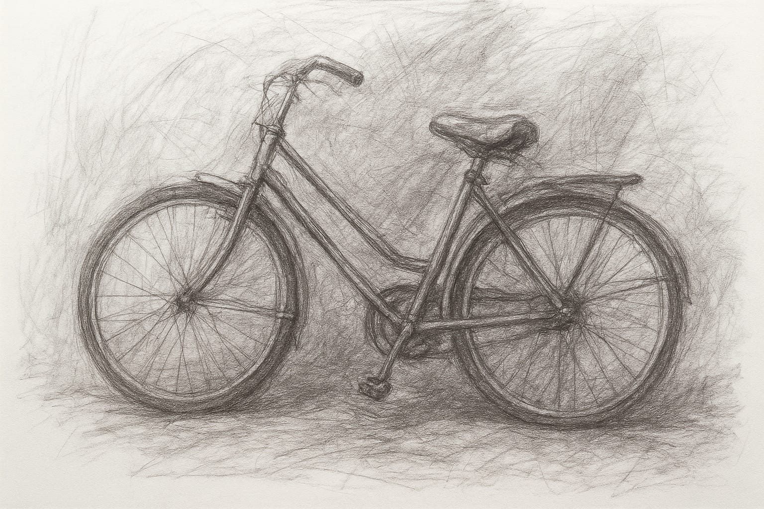 The Negative Space “Ghost”: A drawing where the bicycle itself is pure white paper. I will draw a dense, dark, cluttered environment (perhaps a messy garage or a tangled pile of weeds and junk) and leave the perfect silhouette of the bicycle un-drawn in the center.