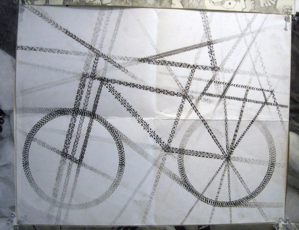 10 ) The Erasure Drawing: Covering the entire 16x20 sheet with solid, dark graphite, and then using various erasers to “draw” the bicycle by removing pigment, creating a ghostly white image emerging from the dark.
