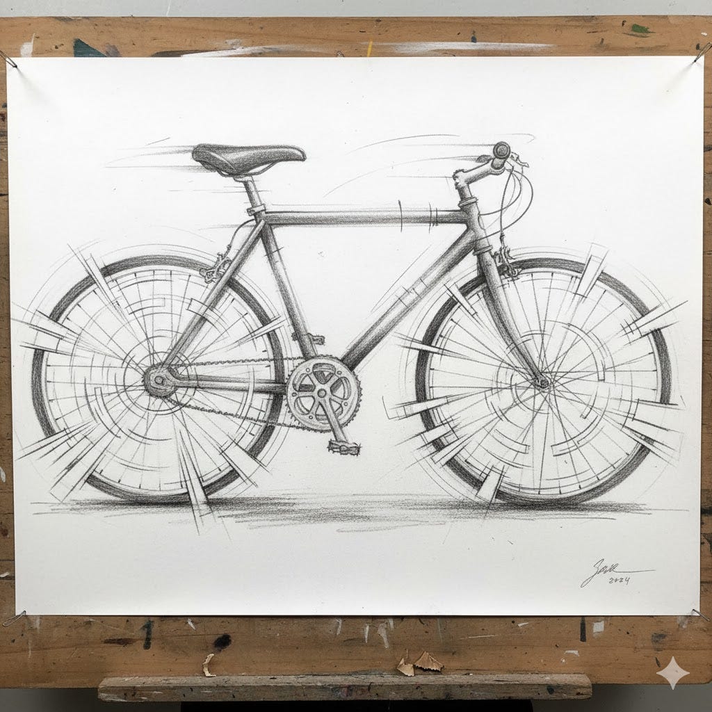 2 ) The Futurism Motion Blur: A drawing not of the bicycle object, but of its movement. A chaotic frenzy of aggressive graphite streaks, smudges, and repeating geometric lines suggesting a bike speeding past, inspired by Italian Futurism.