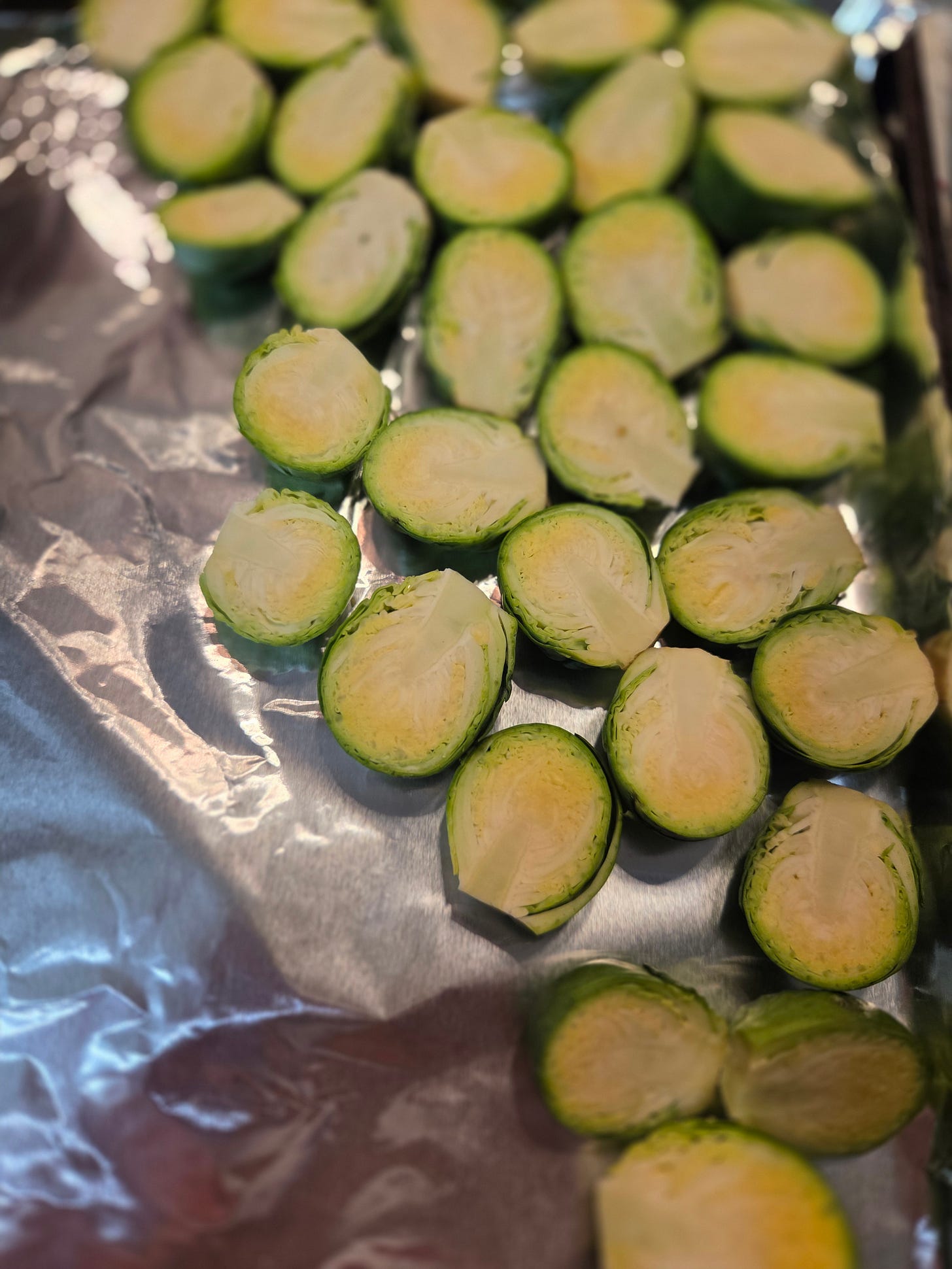 I, regrettably, forgot to take an “after” photo of the cooked sprouts, so I can’t show you what this looks like. Trust me that this is delicious and the method works. Here’s a decent approximation I found online, albeit without my patented arrangement method, on parchment instead of foil, and slightly less cooked than I usually go for: