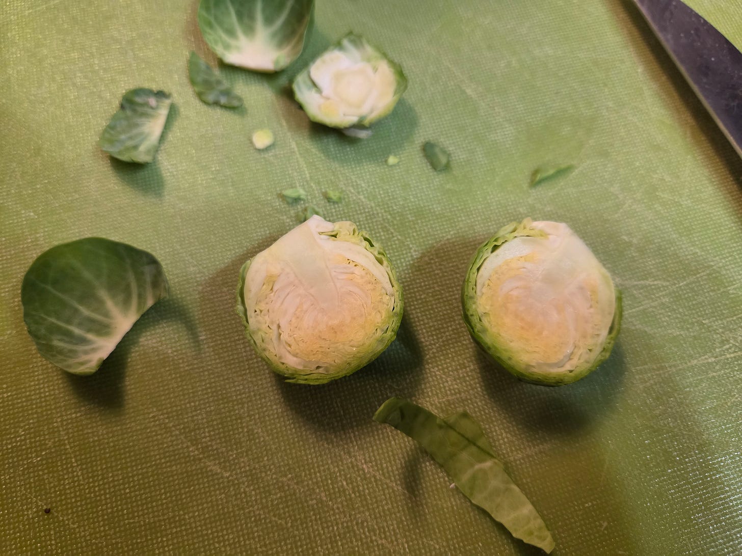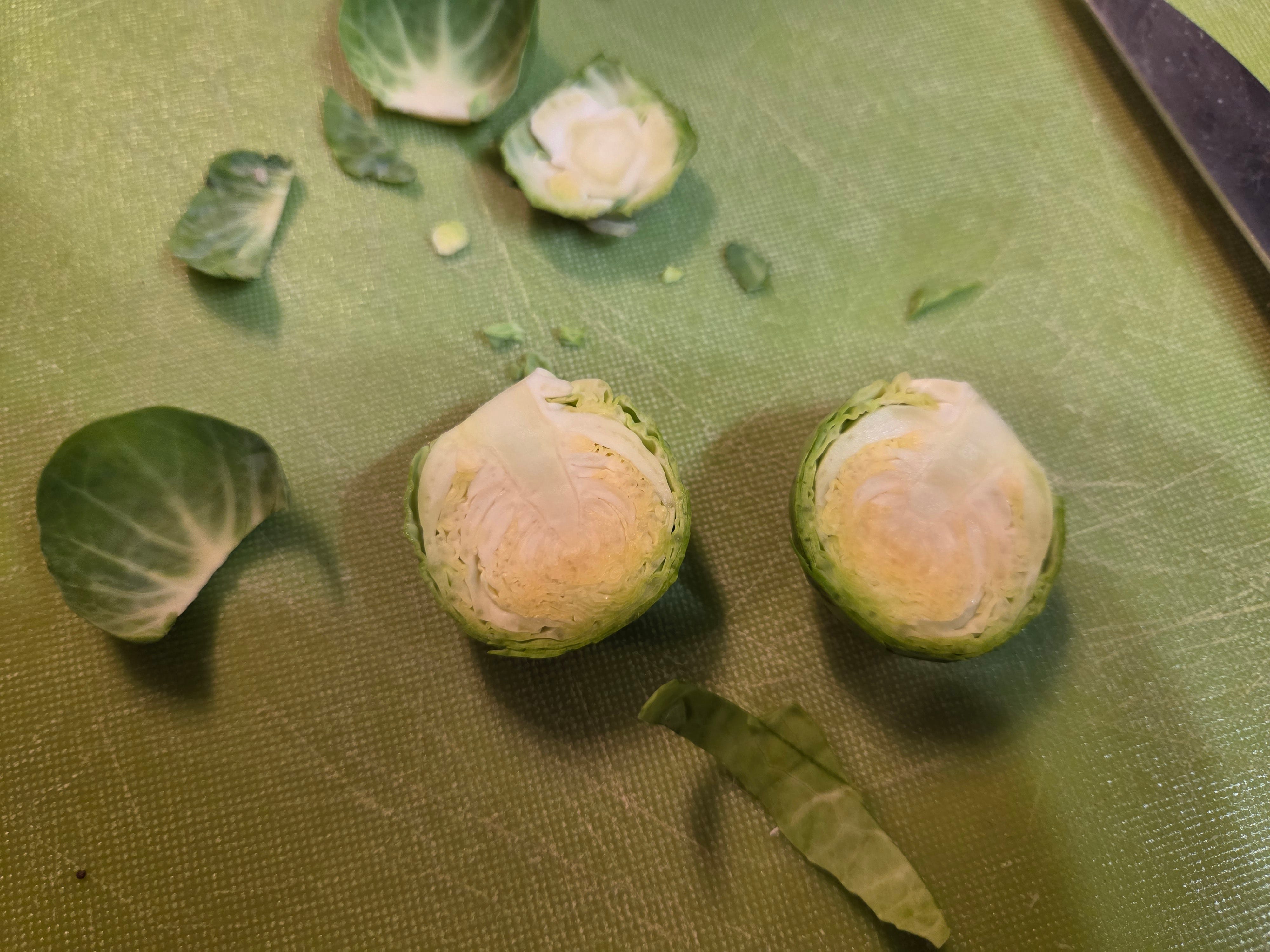 Take each Brussels sprout. Chop off its base and remove any loose leaves. Then, chop in half vertically, such that the cut goes from the base to the outer leaves. Repeat for each Brussels sprout.
